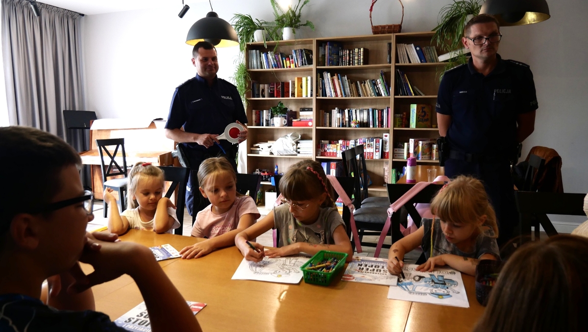 29 sierpnia 2025 roku w Gminnym Ośrodku Kultury w Kodrębie policjanci poruszyli najważniejsze zagadnienia związane z bezpieczeństwem. Rozmawiali z dziećmi o zasadach bezpiecznego poruszania się po drodze, noszeniu elementów odblaskowych, właściwym reagowaniu w kontaktach z nieznajomymi oraz o korzystaniu z numerów alarmowych.