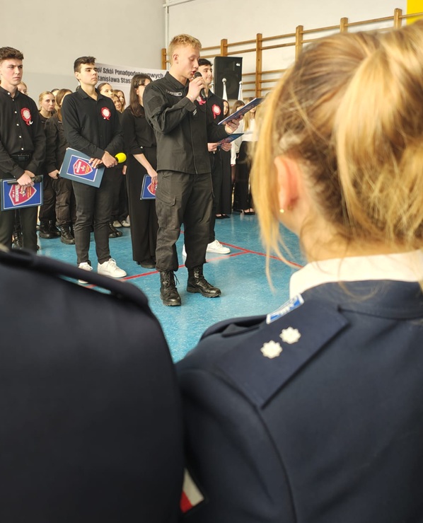 Uroczystość rozpoczęła się od wprowadzenia sztandaru szkoły i odśpiewania hymnu państwowego. Następnie głos zabrała Pani Dyrektor – Ewa Grodzicka, która w swoim przemówieniu podkreśliła znaczenie służby, odpowiedzialności i patriotyzmu w codziennym życiu młodego pokolenia. Dzisiejsze ślubowanie to nie tylko symboliczny początek nauki w klasie mundurowej - policyjnej, ale przede wszystkim zobowiązanie do postawy opartej na wartościach, honorze, uczciwości i gotowości do niesienia pomocy drugiemu człowiekowi.