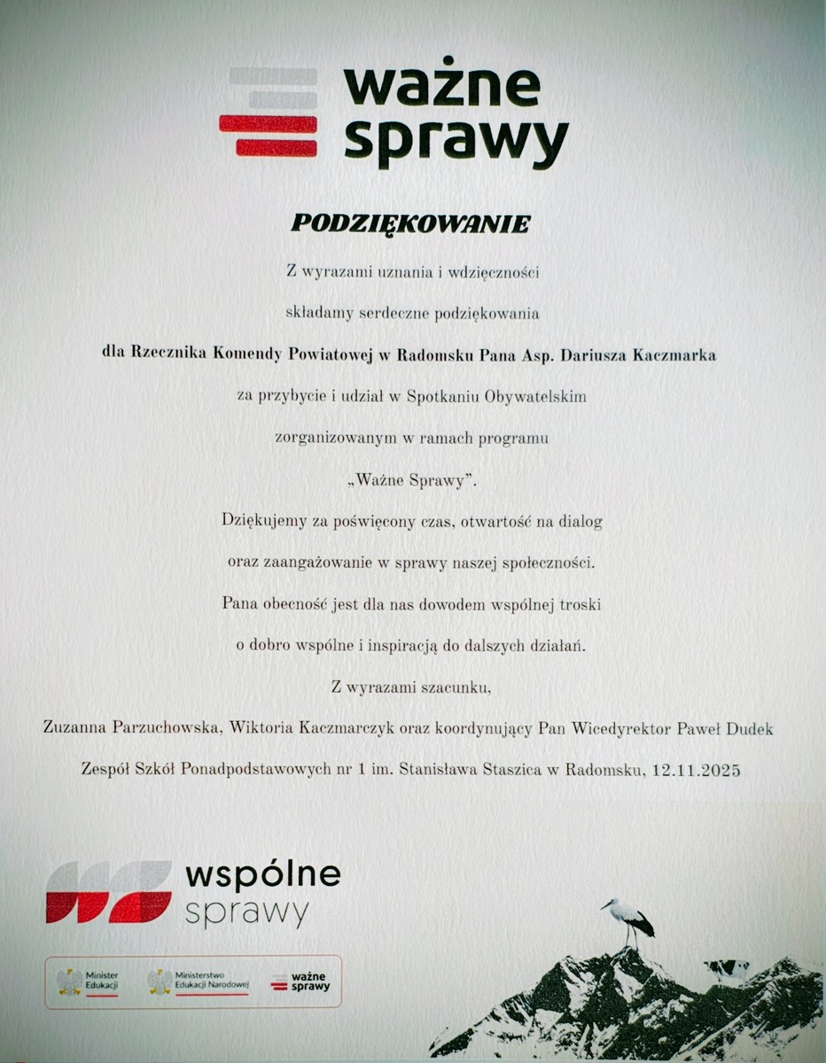 Spotkanie w „Mechaniku” odbyło się w ramach ogólnopolskiego programu „Wspólne Sprawy”, realizowanego przez Fundację Ważne Sprawy we współpracy z Ministerstwem Edukacji Narodowej. W wydarzeniu wzięli udział także przedstawiciele lokalnych instytucji i środowisk: Paweł Pichit – Naczelnik Wydziału Edukacji Starostwa Powiatowego w Radomsku, Marta Drzazga z Miejskiej Biblioteki Publicznej w Radomsku, Ewa Grodzicka – dyrektor szkoły, Renata Koniarska – pedagog szkolny