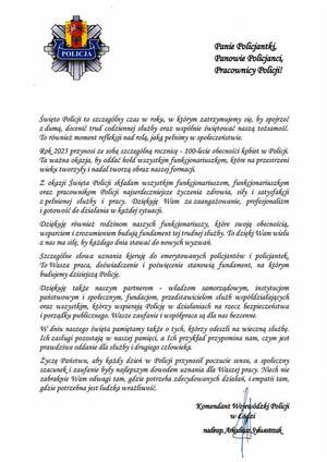 ,,Z okazji Święta Policji składam wszystkim funkcjonariuszom, funkcjonariuszkom oraz pracownikom Policji najserdeczniejsze życzenia zdrowia, siły i satysfakcji z pełnionej służby i pracy. Dziękuję Wam za zaangażowanie, profesjonalizm i gotowość do działania w każdej sytuacji".